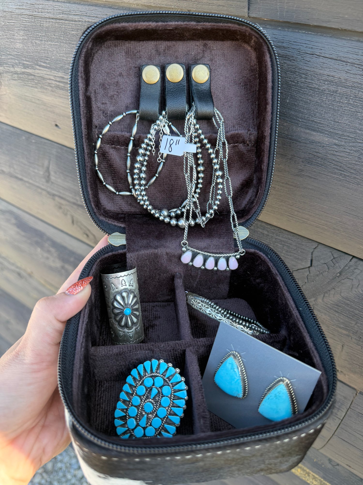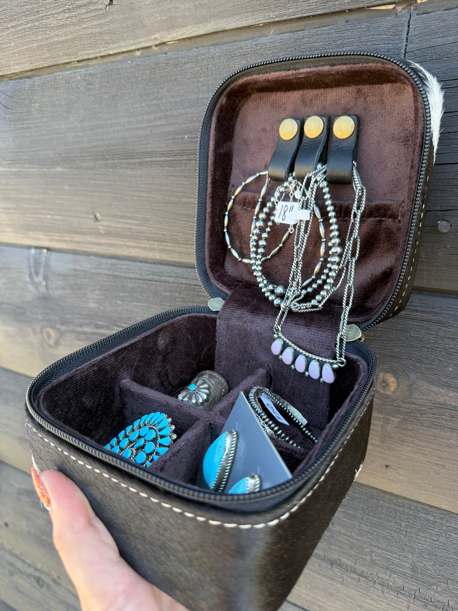 Perfect travel case for your jewelry! Can hold up to 3 necklaces, has 4 boxes for rings, earrings or cuffs!