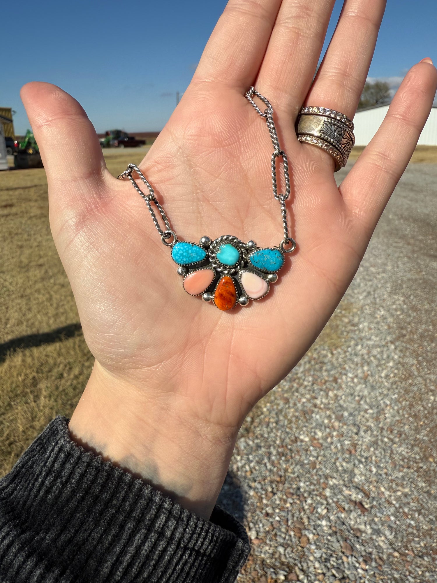 Made by Zuni Artist Carlo Lonjose! Stones are Kingman, Orange Spiny & Pink Conch.