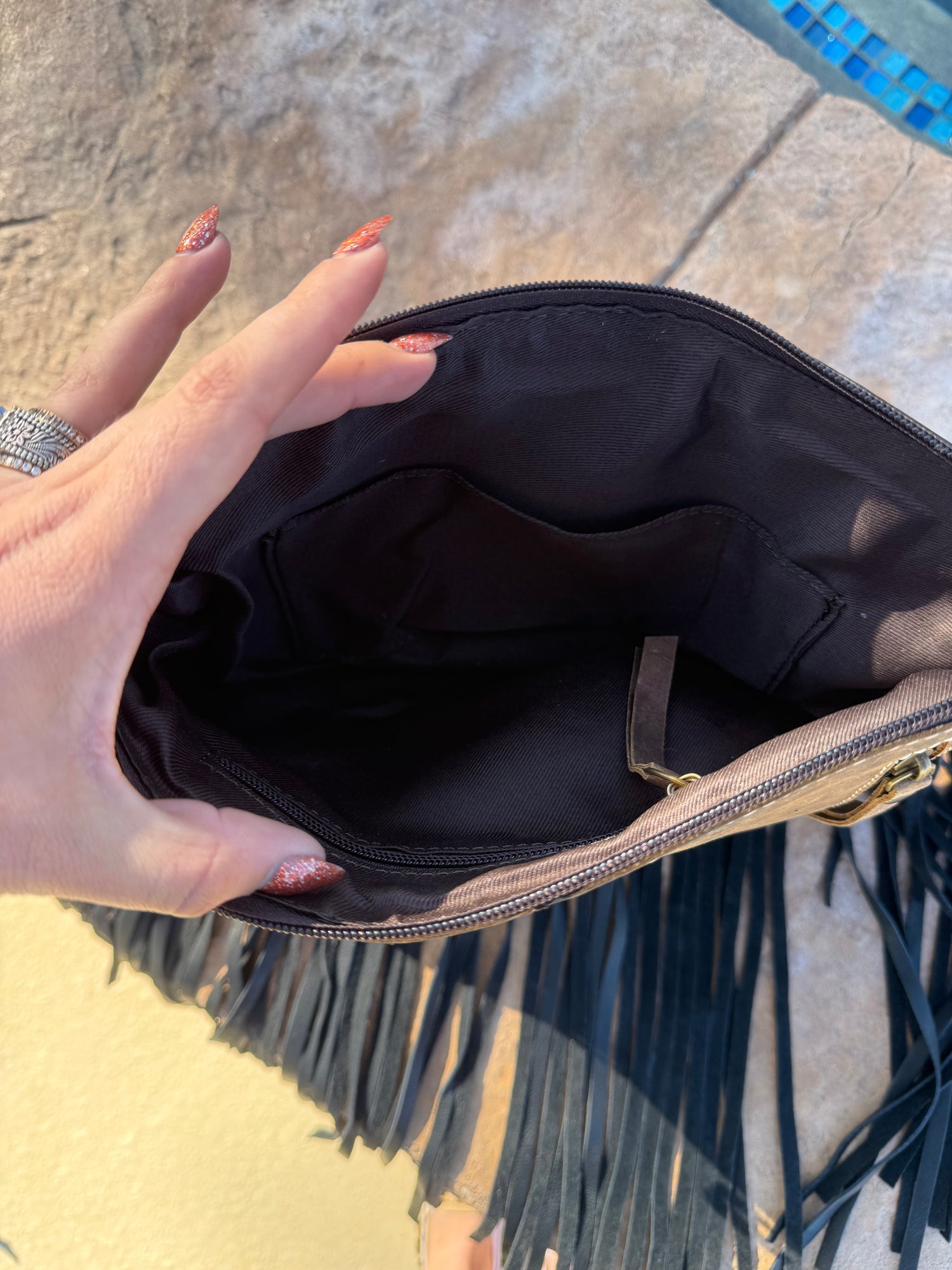 Quite literally the cutest purse I’ve seen! Featured long black fringe on both side, beautiful cowhide, large inside pocket, inside zipper pouch and conceal carry pocket on the back!