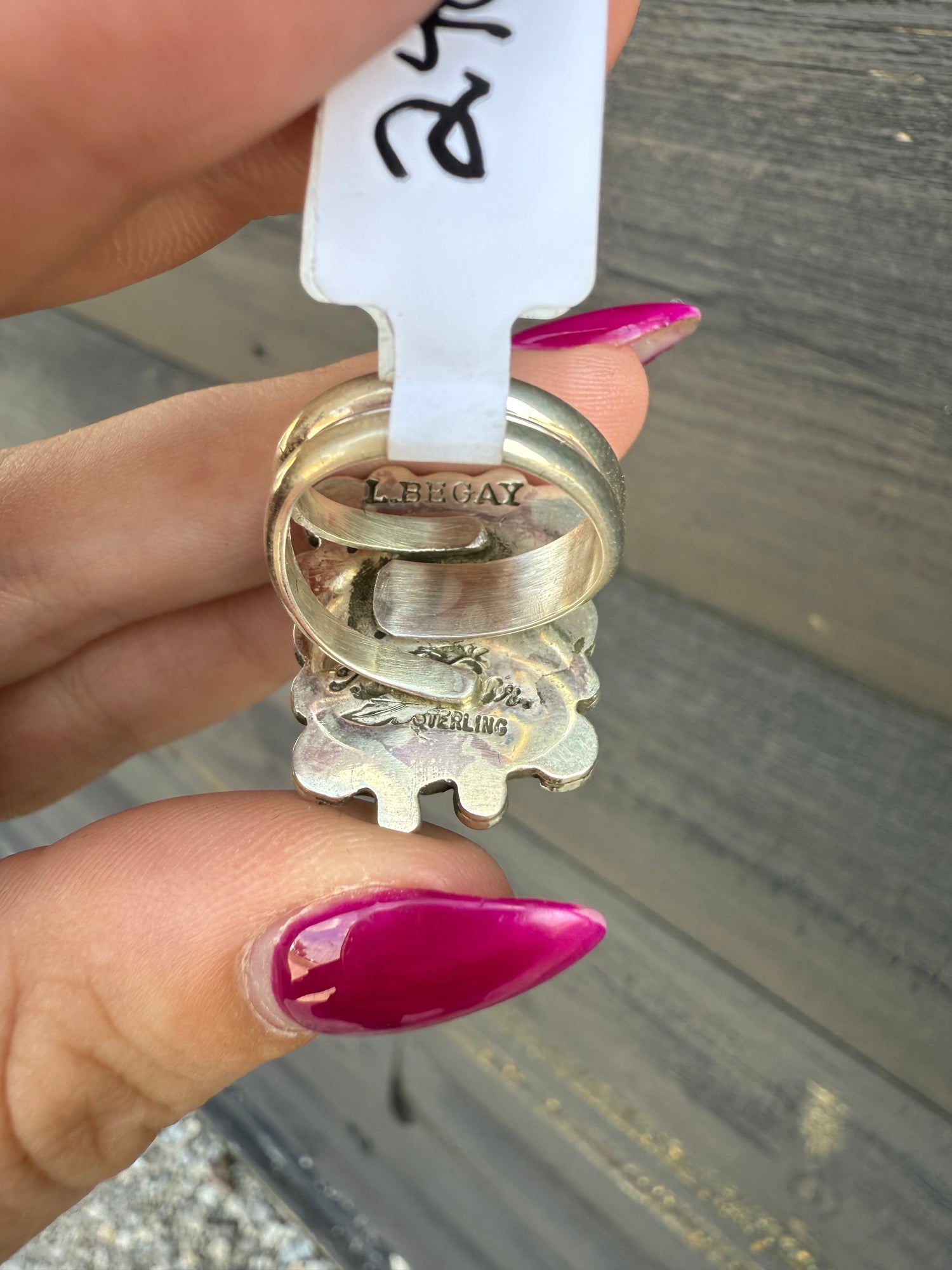 This ring was bought directly from the artist. L Begay is the second stamp you’ll see on this ring, and that is T Nez Sr’s wife! Fully adjustable