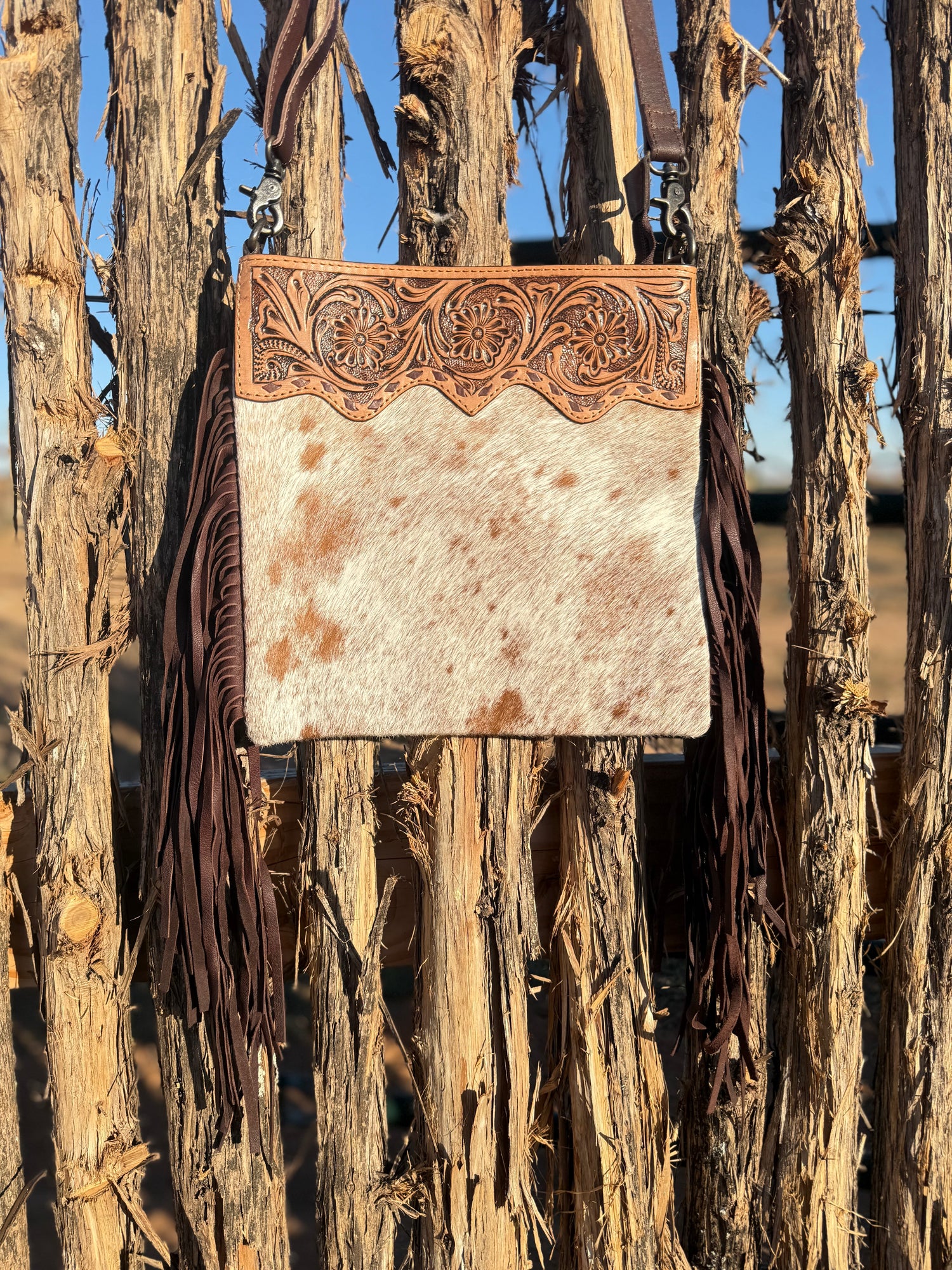 This purse features beautiful tan and white cowhide, brown leather fringe and leather tooling on the front! Also has a conceal carry pocket on the back!
